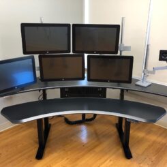 Với mặt bàn kép kích thước rộng có thể chứa tối đa 7 màn hình mở rộng , độ cong 90 độ có thể bố tri ngay góc tiết kiệm được không gian cho căn nhà của bạn .